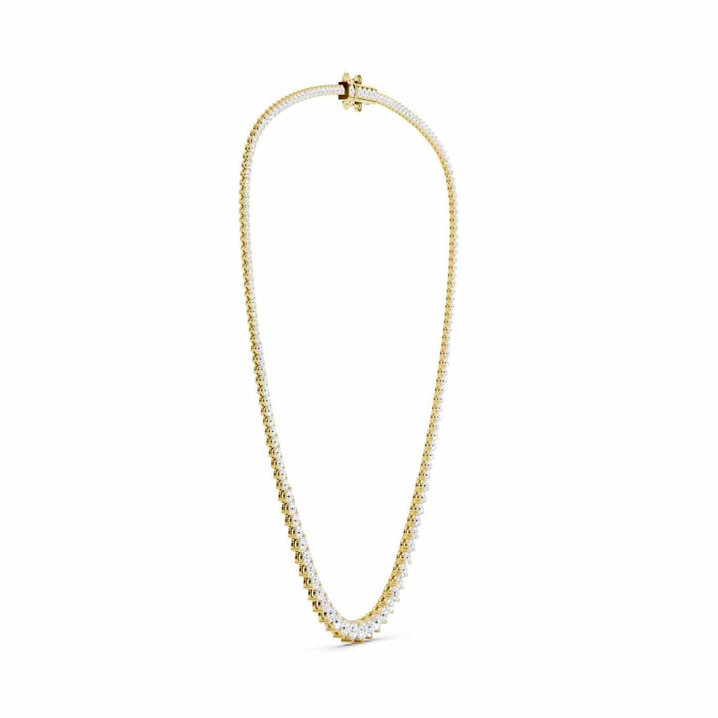 Available in 5 cttw, 7 cttw, and 10 cttw, the Valorelle Necklace collection features resplendent round diamonds, each a beacon of brilliance with F/VS clarity. This exquisite array captures the essence of elegance, allowing you to choose the perfect size that reflects your unique style and grace. The Valorelle Necklace | 10ct showcases a magnificent 10 cttw of round diamonds, elevating the collection's elegance to new heights of sophistication. Weight (18k): 18.48 g